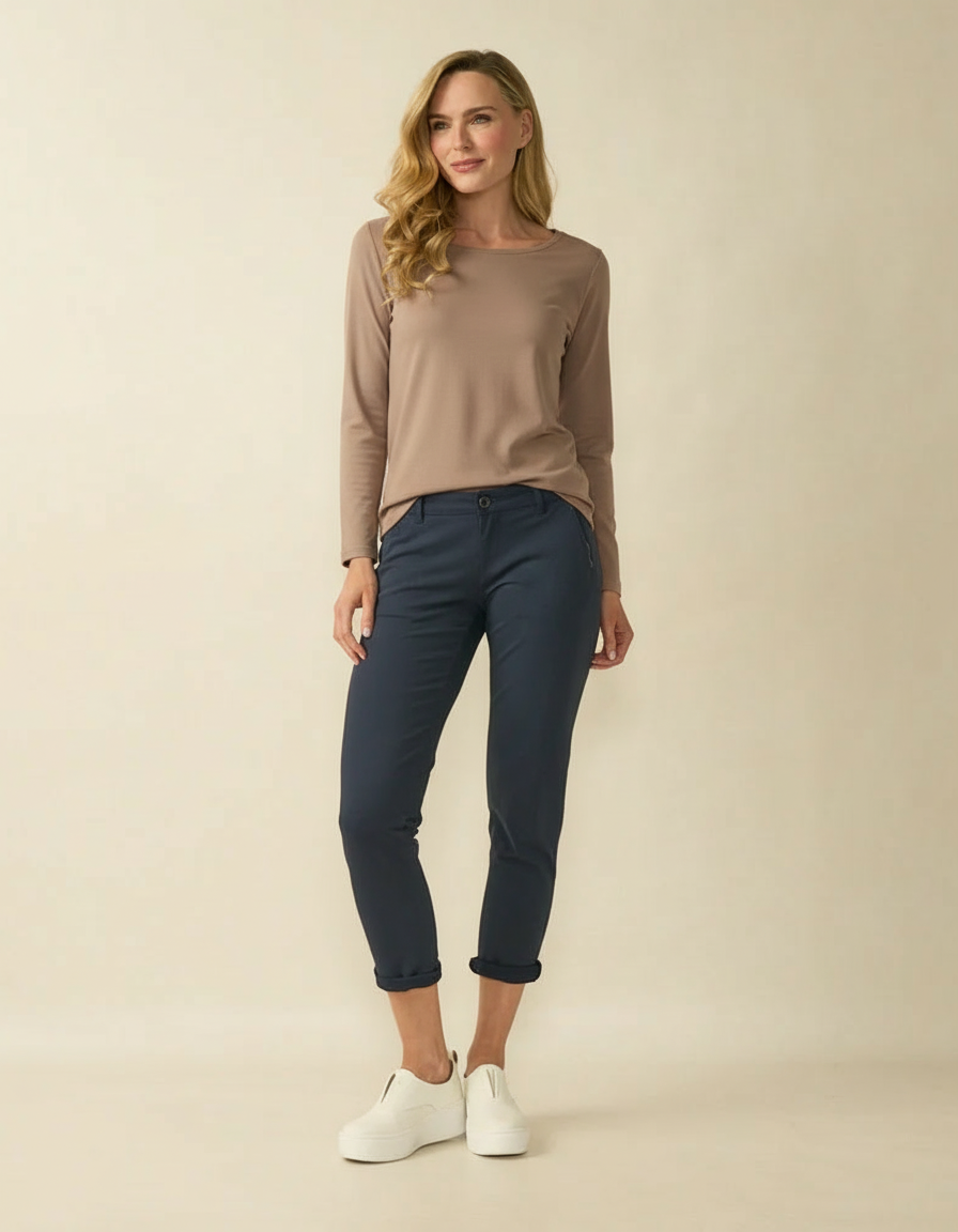Das taupefarbene Basic-Top PAULA besticht durch einen klassischen Rundhalsausschnitt und lange Ärmel. Als vielseitiges Basic-Teil lässt es sich nahtlos in jede Garderobe integrieren und ist ideal zum Kombinieren oder solo tragen – mit Leichtigkeit und Selbstbewusstsein.